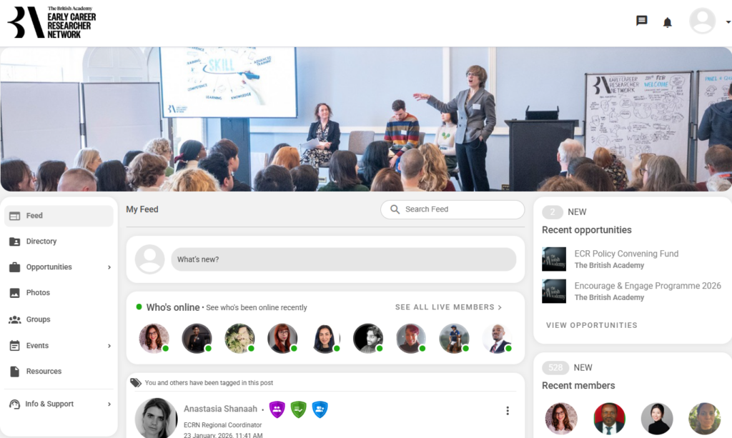 Navigating this window of opportunity can be challenging, which is why the British Academy launched the Early Career Researcher Network (ECRN) – a free-to-join, researcher-led membership body accessible to all UK-based early career researchers (ECRs) working in the humanities and social sciences, regardless of their funding history or background.